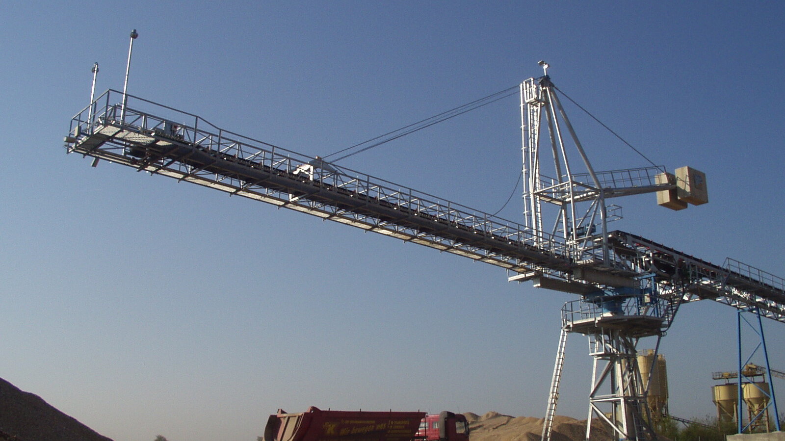 Eine Hebe- und Senkeinrichtung ermöglicht die stufenlose Anpassung des Absetzbandes an die jeweilige Haldenhöhe mit Hilfe einer elektrischen Seilwinde. Somit ist immer ein schonender Abwurf der Schüttgüter gewährleistet.