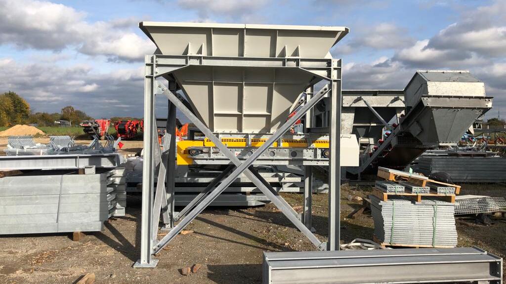 | der Trichter besteht aus | einer kräftigen Blech- und Profilstahlkonstruktion mit Versteifungen, optional mit Schleißblechen im unteren Drittel, einschließlich dem oberen umlaufenden Rahmen, einer Unterstützungskonstruktion aus Profilstahl, mit Windverbänden und Knotenblechen, in verschraubter Ausführung, einem Satz Kufen unter der Unterstützungskonstruktion, zum Versetzen des Trichters im Gelände. Der Trichter wird mit einem Radlader beschickt, alternativ über bauseitige Anfahrrampe in Verbindung mit Anfahrschutz am Stahlbau. |