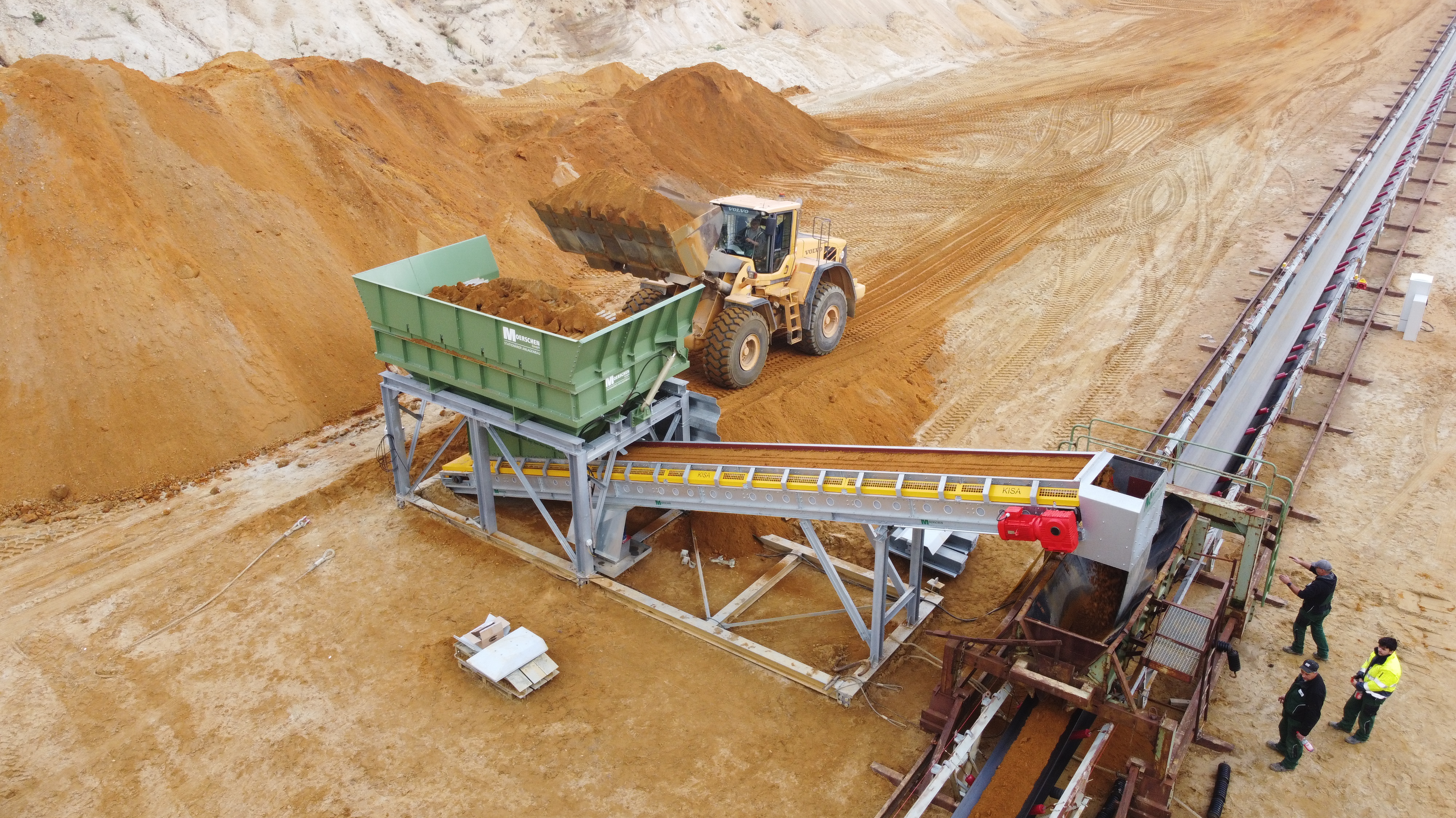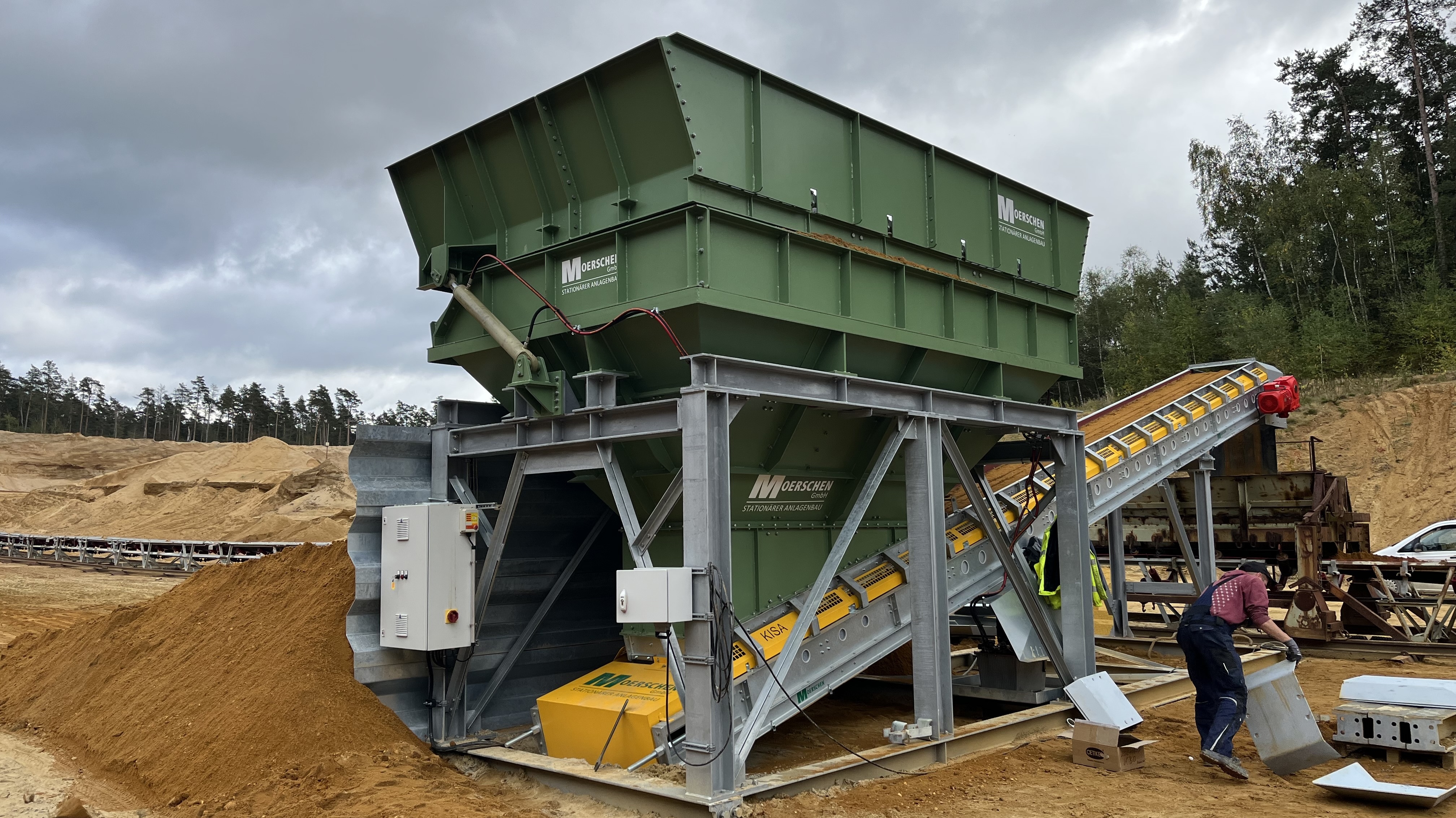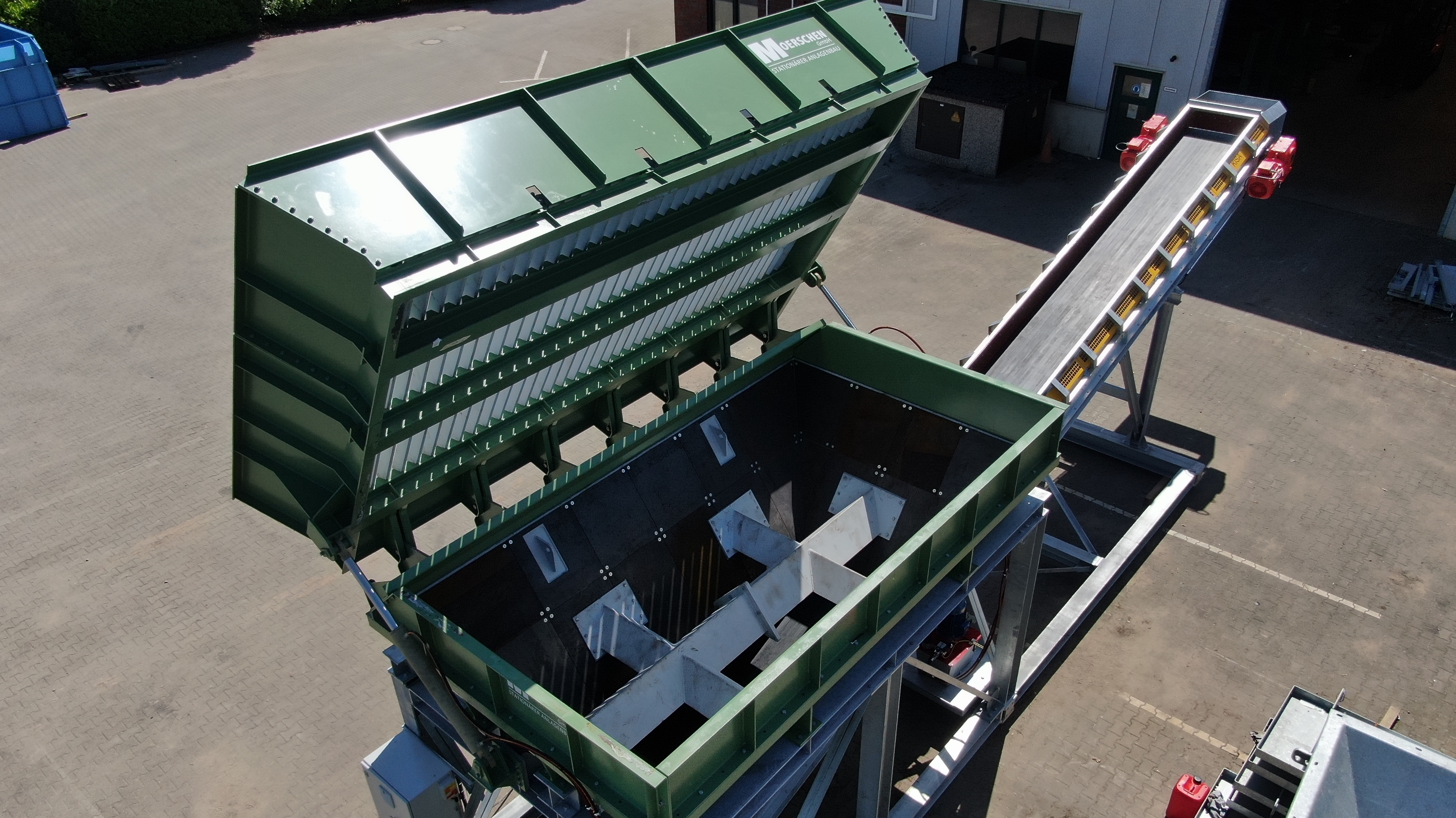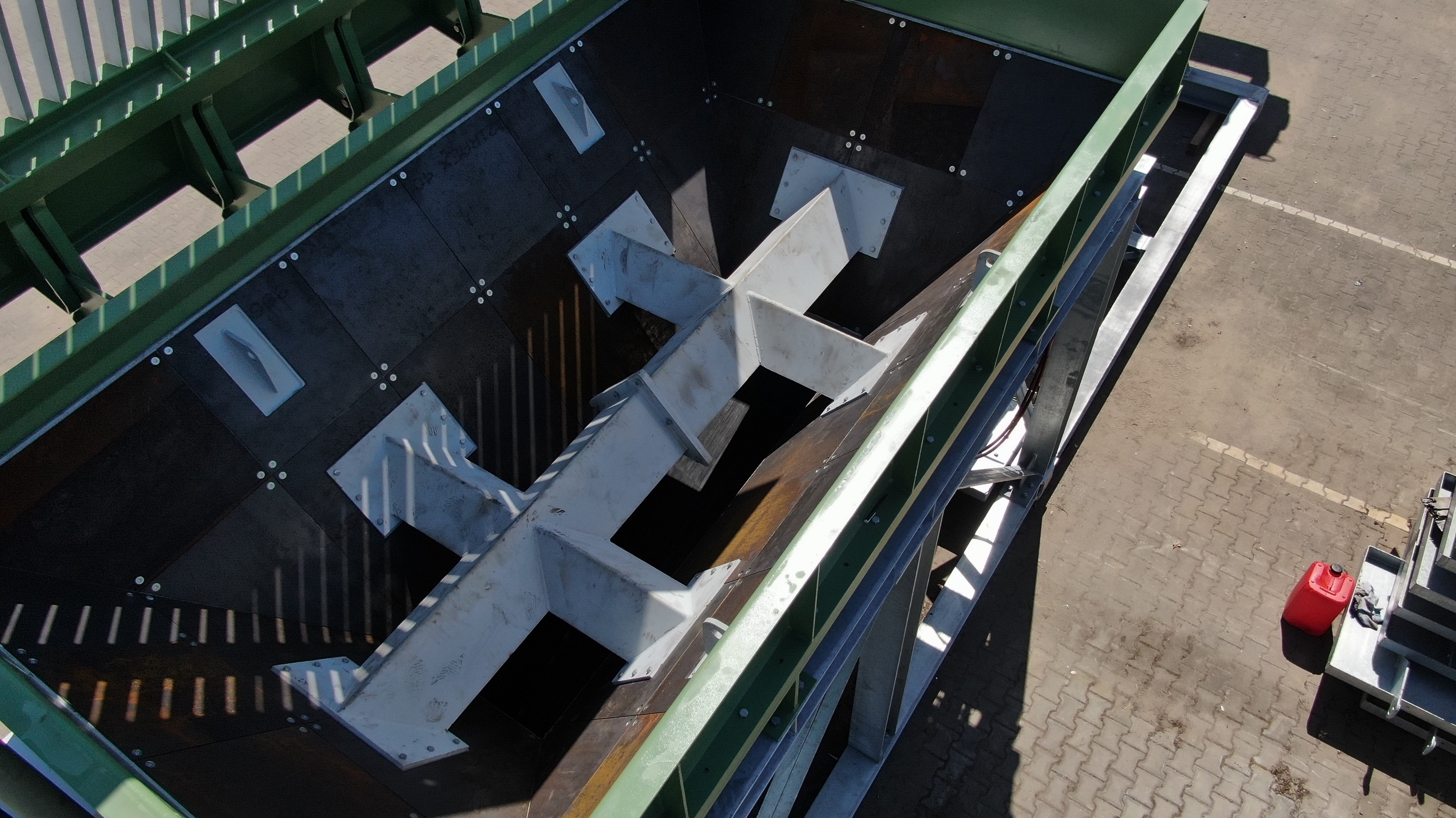 | der Trichter besteht aus | einer kräftigen Blech- und Profilstahlkonstruktion mit Versteifungen, optional mit Schleißblechen im unteren Drittel, einschließlich dem oberen umlaufenden Rahmen, einer Unterstützungskonstruktion aus Profilstahl, mit Windverbänden und Knotenblechen, in verschraubter Ausführung, einem Satz Kufen unter der Unterstützungskonstruktion, zum Versetzen des Trichters im Gelände. Der Trichter wird mit einem Radlader beschickt, alternativ über bauseitige Anfahrrampe in Verbindung mit Anfahrschutz am Stahlbau. |