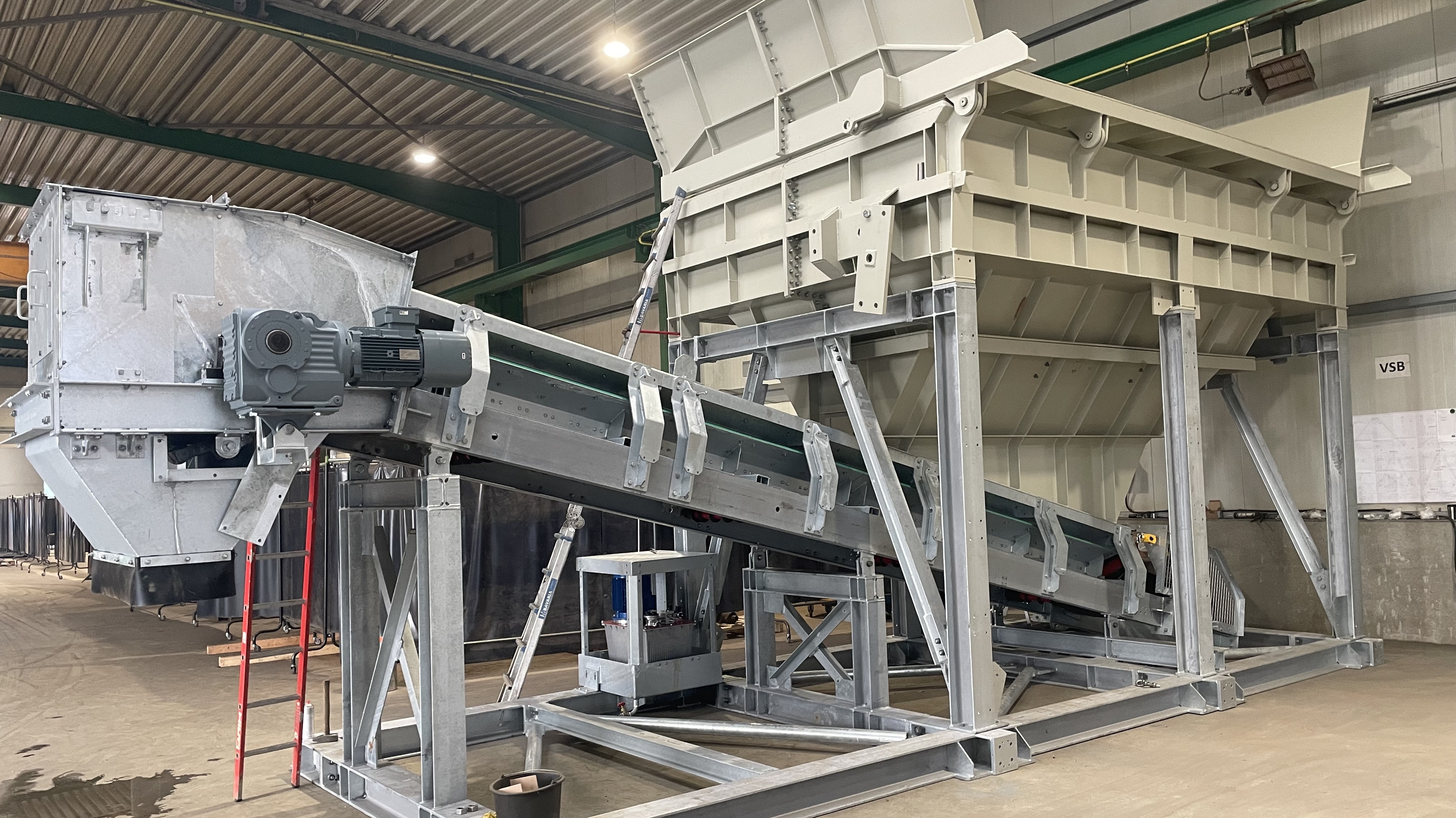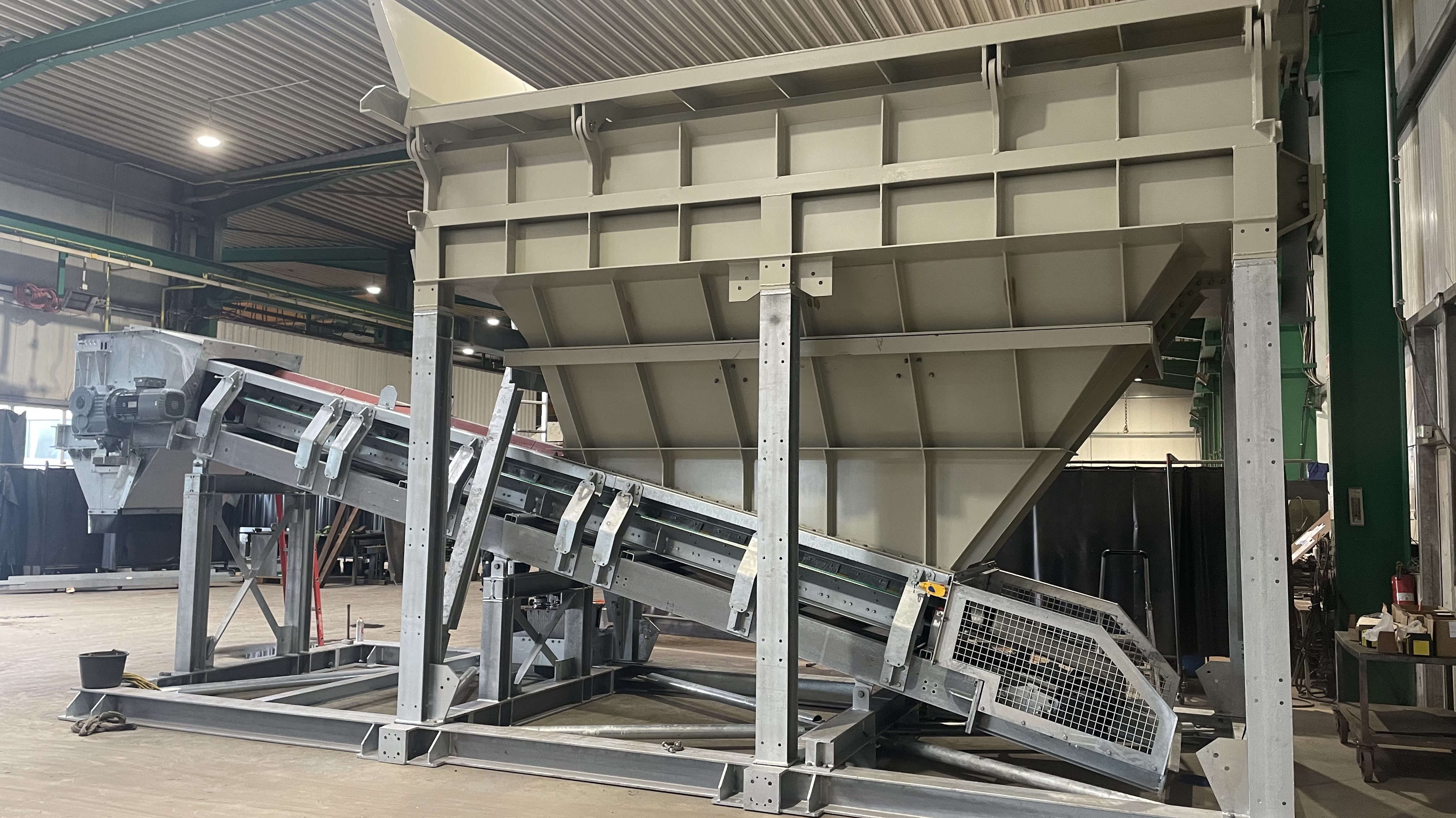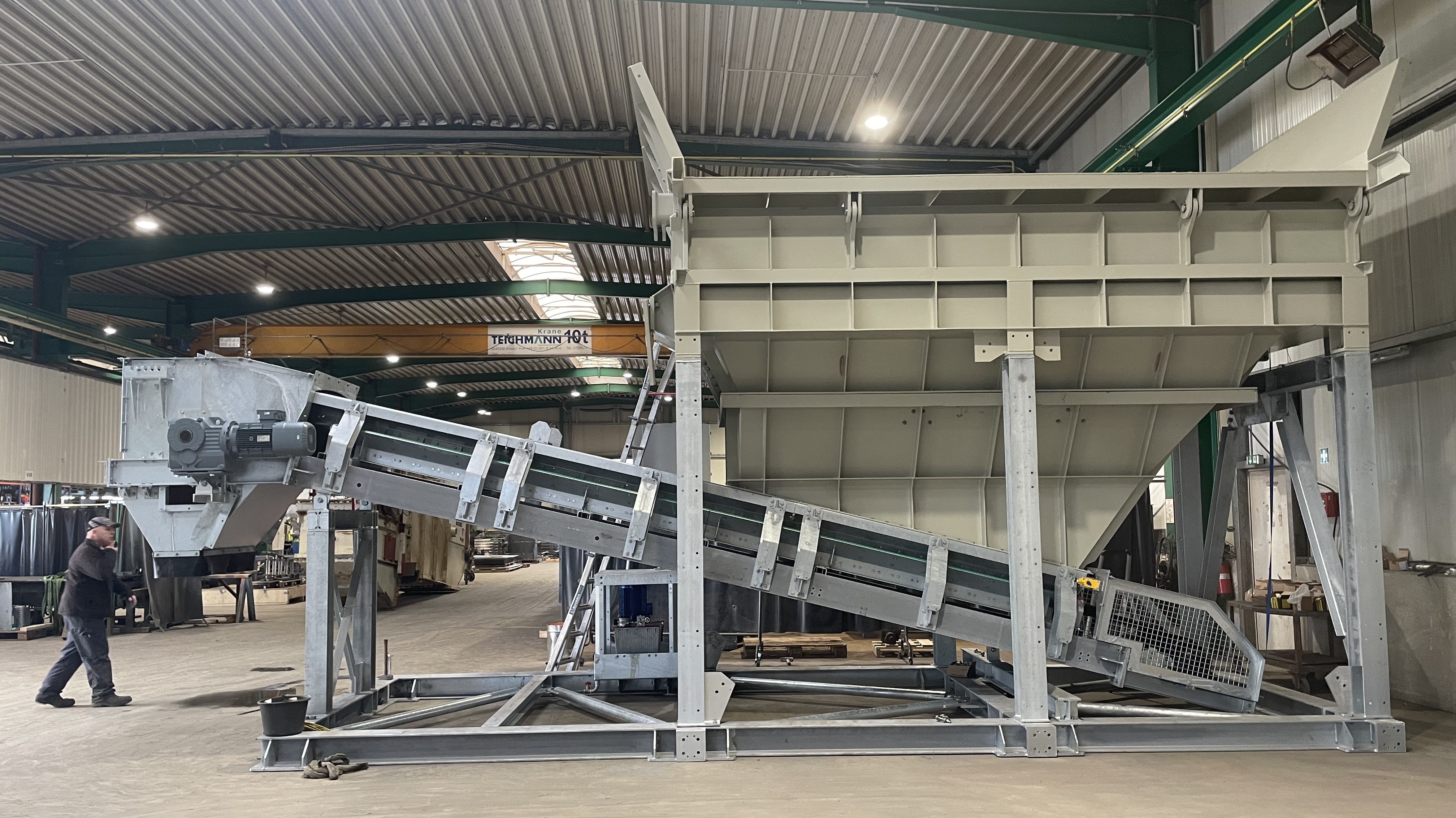 | der Trichter besteht aus | einer kräftigen Blech- und Profilstahlkonstruktion mit Versteifungen, optional mit Schleißblechen im unteren Drittel, einschließlich dem oberen umlaufenden Rahmen, einer Unterstützungskonstruktion aus Profilstahl, mit Windverbänden und Knotenblechen, in verschraubter Ausführung, einem Satz Kufen unter der Unterstützungskonstruktion, zum Versetzen des Trichters im Gelände. Der Trichter wird mit einem Radlader beschickt, alternativ über bauseitige Anfahrrampe in Verbindung mit Anfahrschutz am Stahlbau. |