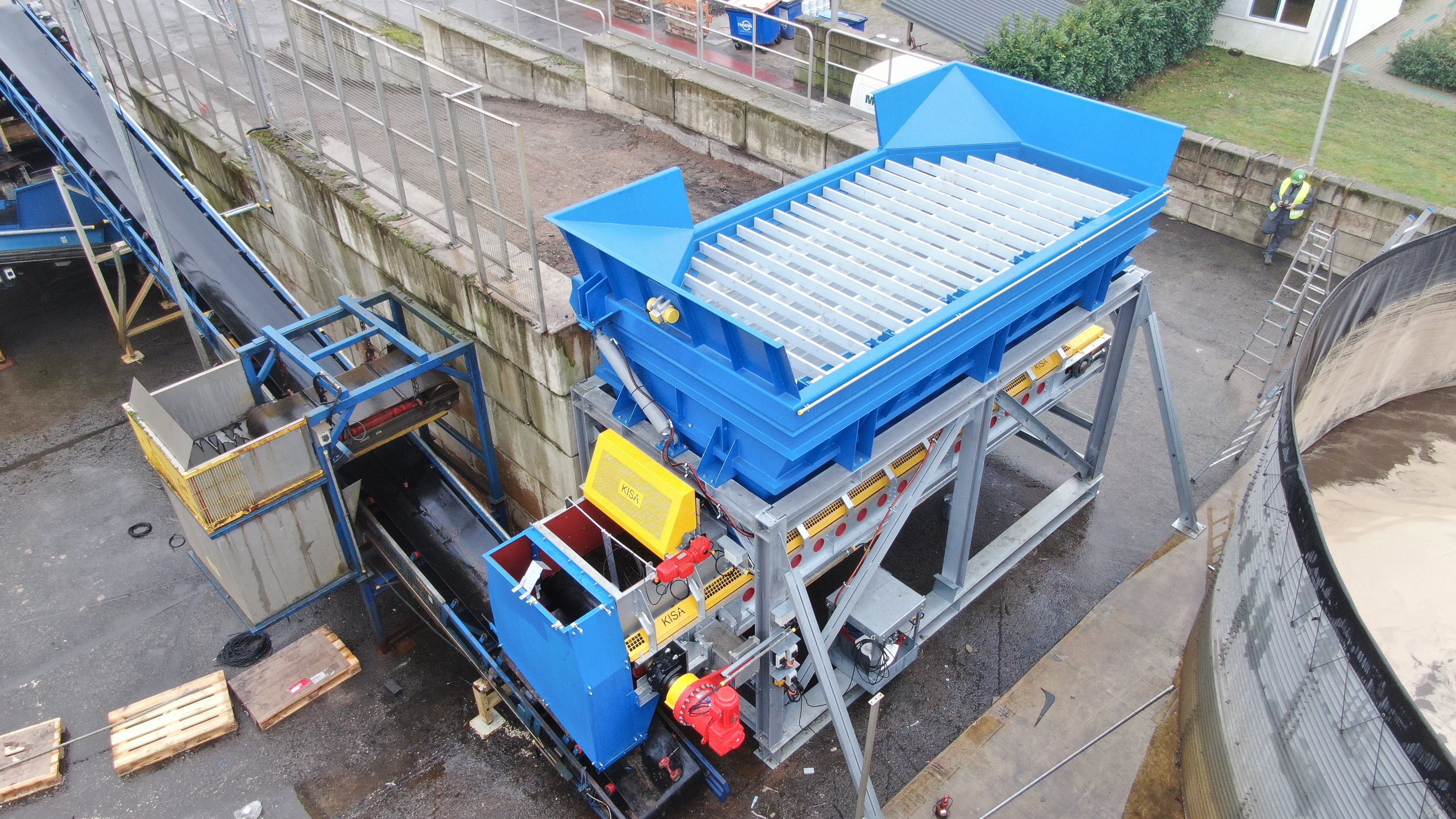 | der Trichter besteht aus | einer kräftigen Blech- und Profilstahlkonstruktion mit Versteifungen, optional mit Schleißblechen im unteren Drittel, einschließlich dem oberen umlaufenden Rahmen, einer Unterstützungskonstruktion aus Profilstahl, mit Windverbänden und Knotenblechen, in verschraubter Ausführung, einem Satz Kufen unter der Unterstützungskonstruktion, zum Versetzen des Trichters im Gelände. Der Trichter wird mit einem Radlader beschickt, alternativ über bauseitige Anfahrrampe in Verbindung mit Anfahrschutz am Stahlbau. |