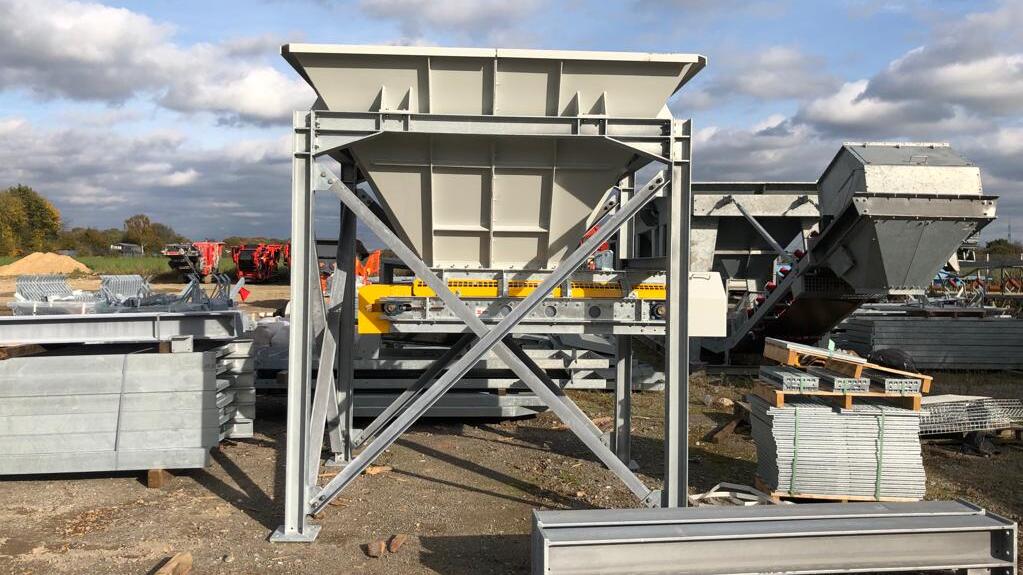 | der Trichter besteht aus | einer kräftigen Blech- und Profilstahlkonstruktion mit Versteifungen, optional mit Schleißblechen im unteren Drittel, einschließlich dem oberen umlaufenden Rahmen, einer Unterstützungskonstruktion aus Profilstahl, mit Windverbänden und Knotenblechen, in verschraubter Ausführung, einem Satz Kufen unter der Unterstützungskonstruktion, zum Versetzen des Trichters im Gelände. Der Trichter wird mit einem Radlader beschickt, alternativ über bauseitige Anfahrrampe in Verbindung mit Anfahrschutz am Stahlbau. |